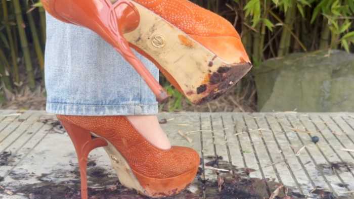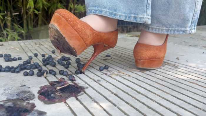 2.用前脚掌批量碾碎蓝莓,拍到鞋底浸满了紫色的汁水和残渣果皮