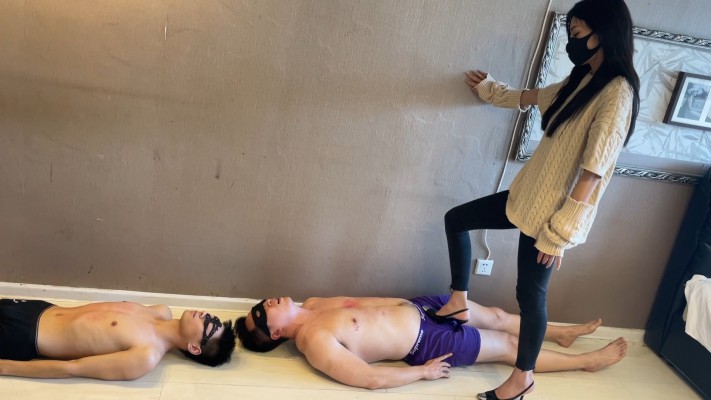内容:贝儿女神穿着尖头细高跟,全体重踩踏责罚脚下的两个M(其中一个特别瘦小,排骨男)伴随响亮的轮流耳光,高跟鞋虐乳,强制脚深喉等,脚下的两个M忍受着剧烈痛苦嗷嗷叫,又体验着被女神近距离调教的快感。全片时长长达42分钟,相当于两部作品的时长,绝对让你大饱眼福。