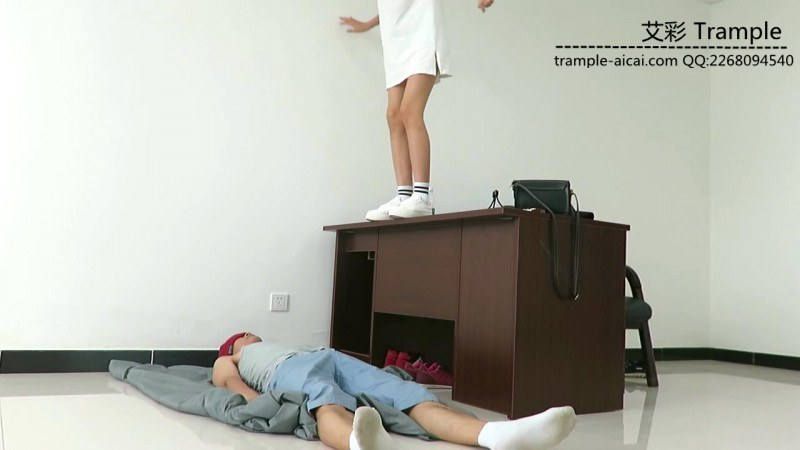 超长时间,女主白色帆布鞋,站在一米高的桌子上往贱狗身上跳跃,踩踏,蹦跳!