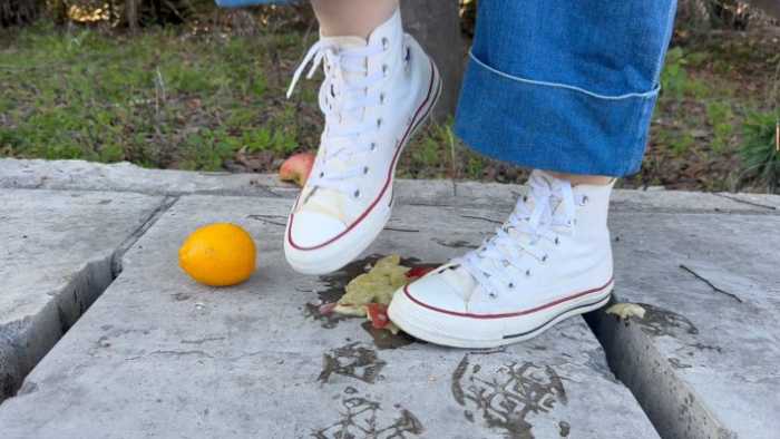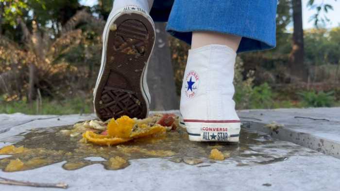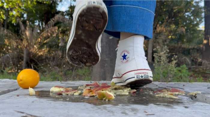 关键词:正版经典匡威Chuck Taylor All Star+鞋底展示+户外拍摄+软(橙子)硬(苹果)食材组合