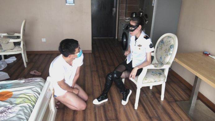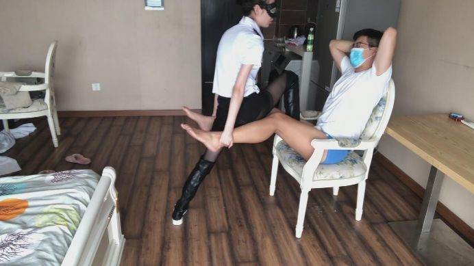 这个人真是不老实,经过那么多惩罚还是不交代,那就由我来好好的招待他吧。我用脚一边挑逗他的下面,一边质问他,他居然不屑一顾,我一记耳光加上狠狠一脚踢在他的dd上,他瞬间求饶了,原来是装坚强,加下来看我怎么收拾他,不一会全都交代了,但是我却忍不住继续虐待他,我狠狠地碾踩他的下面,就是为了发泄一下,尽管他多么痛苦。就在我一转身,他居然跑掉了,很快被我抓了回来,加下来可别怪我不客气,我全体重踩在他身上,集中对他的裆部碾踩,狠踢着,无奈脚在靴子里出汗了,那么我就脱下靴子,黑丝脚踩他的脸,还要折磨让他更加痛苦!