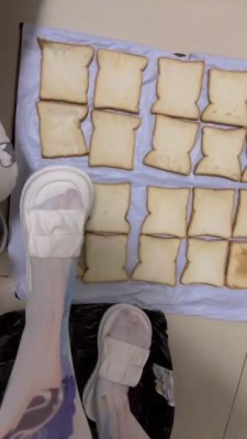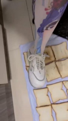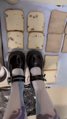又是超可爱的桃子姐姐呀,今天要给狗狗制作狗粮了,只是几片面包狗狗肯定吃不饱吧?姐姐会用每一双鞋子加工食物哦,一共十几二十双鞋子吧?每一片面包都会印上狗狗喜欢的鞋印哦。贱狗还觉得不够?那让姐姐为你加点泥土,狗狗可要好好的都吃掉哦!