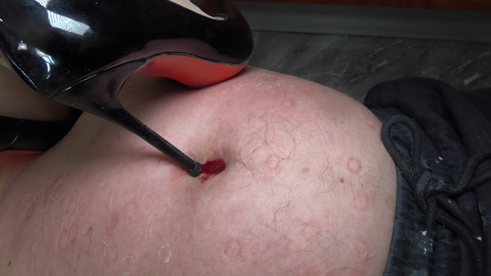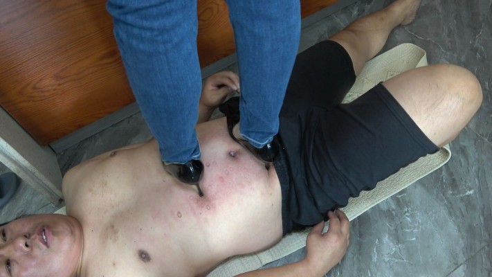 高跟全体重狠踩青龙,下脚丝毫不留情,踩肚脐踩出血后接着踩,鞋跟深深扎进肚脐里,不管青龙的痛苦求饶,最后肚脐全是血!